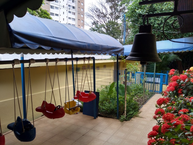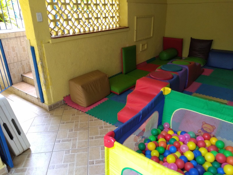 Na área coberta temos uma brinquedoteca, hall de ginástica, biblioteca, espaço para andar de bi e triciclos, sala de atividades/refeições e caixa de areia.