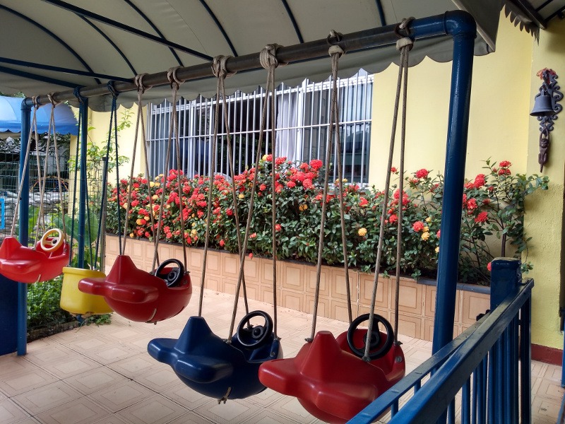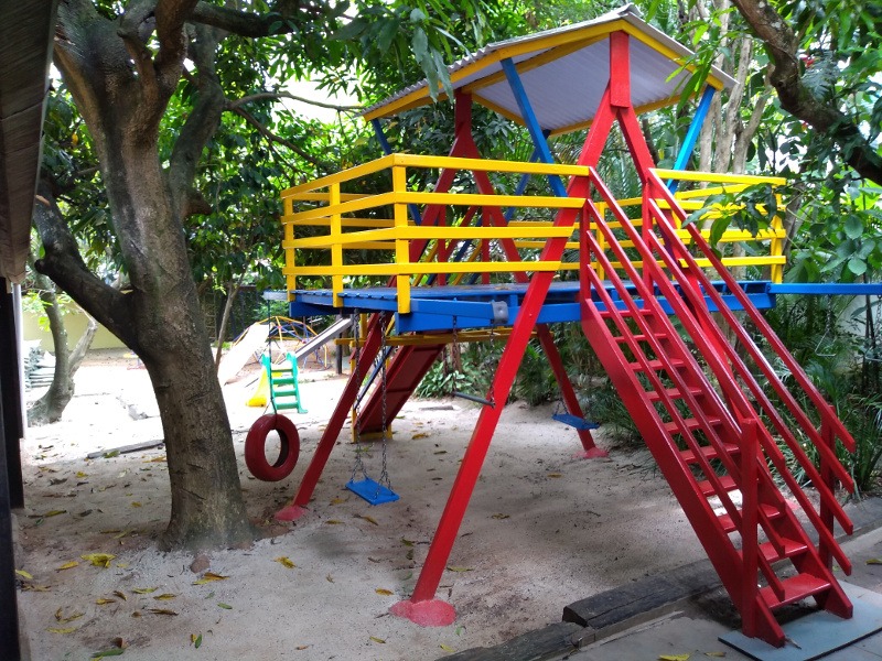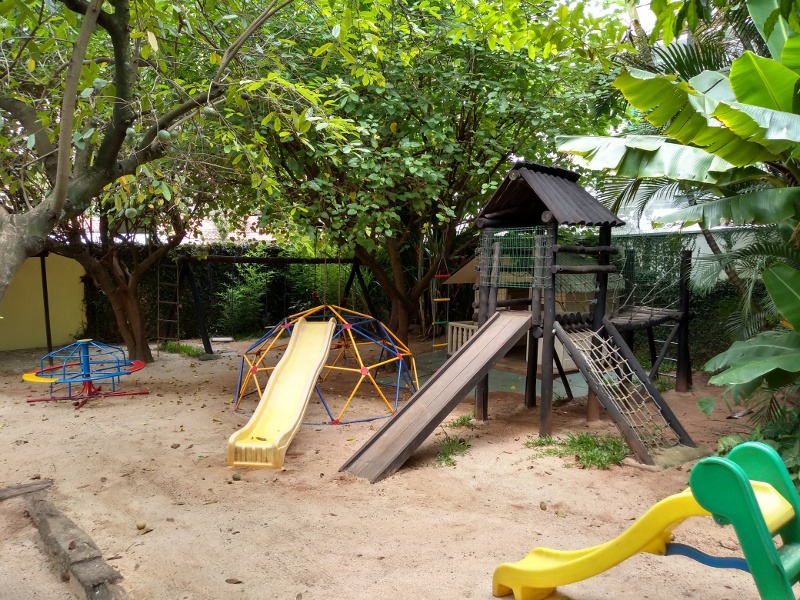 Temos uma área externa de 500m² com balanços, escorregadores, gira-gira, ponte pênsil, casinha de Tarzan, trepe-trepa, casa de bonecas, areia, horta, árvores frutíferas em que se pode subir e uma floresta.